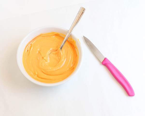 Melt the yellow and orange coating chocolate in the same heatproof bowl. Stir the colors to combine.